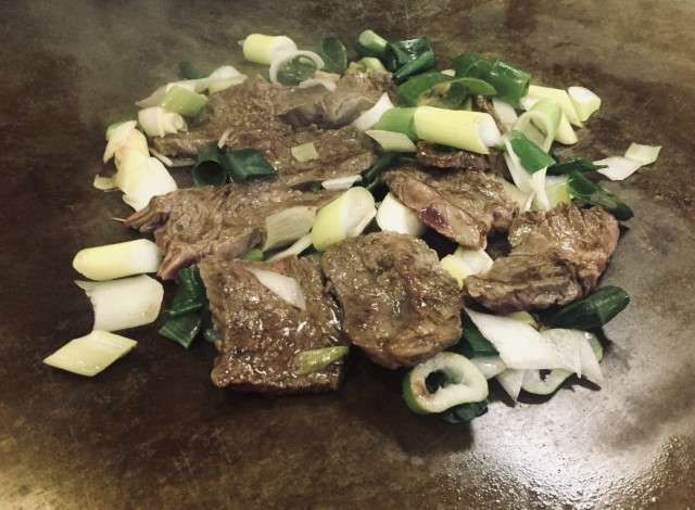 焼場前のカウンター奥に通され、一五センチほど先にある熱々の鉄板で亭主が肉を焼く。
